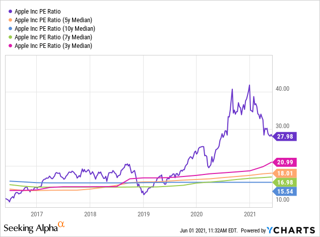 Nel grafico sopra, vediamo anche i multipli dei guadagni medi negli ultimi 3, 5, 7 e 10 anni. È abbastanza chiaro che la valutazione di Apple si è ampliata nel corso degli anni, motivo per cui i valori mediani sono più alti per i periodi di “ricerca” più brevi.